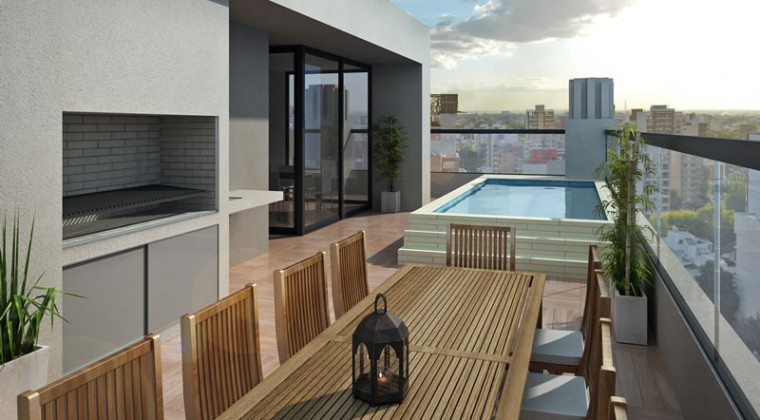 El edificio cuenta con un distinguido Lobby de acceso jerarquizado, terraza solárium con parrilla y piscina, salón de usos múltiples, cocheras cubiertas, instalación para grupo electrógeno y cámaras IP de seguridad.